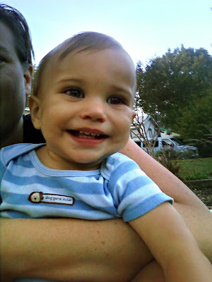 1. He found my cell phone this morning and rather than trying to eat it or bang it on the couch cushions (where I had left it), he put it to his ear and started babbling and smiling at me!